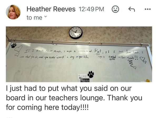 To go back to my original point, I realized today that I am still going back in my classroom & remember why I came there in the first place....because of you...you reminded me that it was my heart all those 30 years ago...thanks, XXXXX