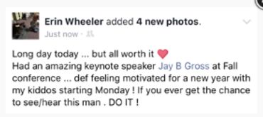 But what really set Jay apart was his incredible ability to connect on an emotional level. In a single presentation, he had us all laughing and crying—often at the same time. His storytelling, authenticity, and passion moved our entire community in a way that no speaker has in decades. As a superintendent, I had countless staff members approach me afterward to thank me for simply bringing Jay to them. They felt seen, heard, and inspired in ways they hadn’t experienced before.