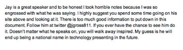Jay Gross covered so much ground. Great ideas. I would have like a little clearer picture of what his day to day classroom looked like.